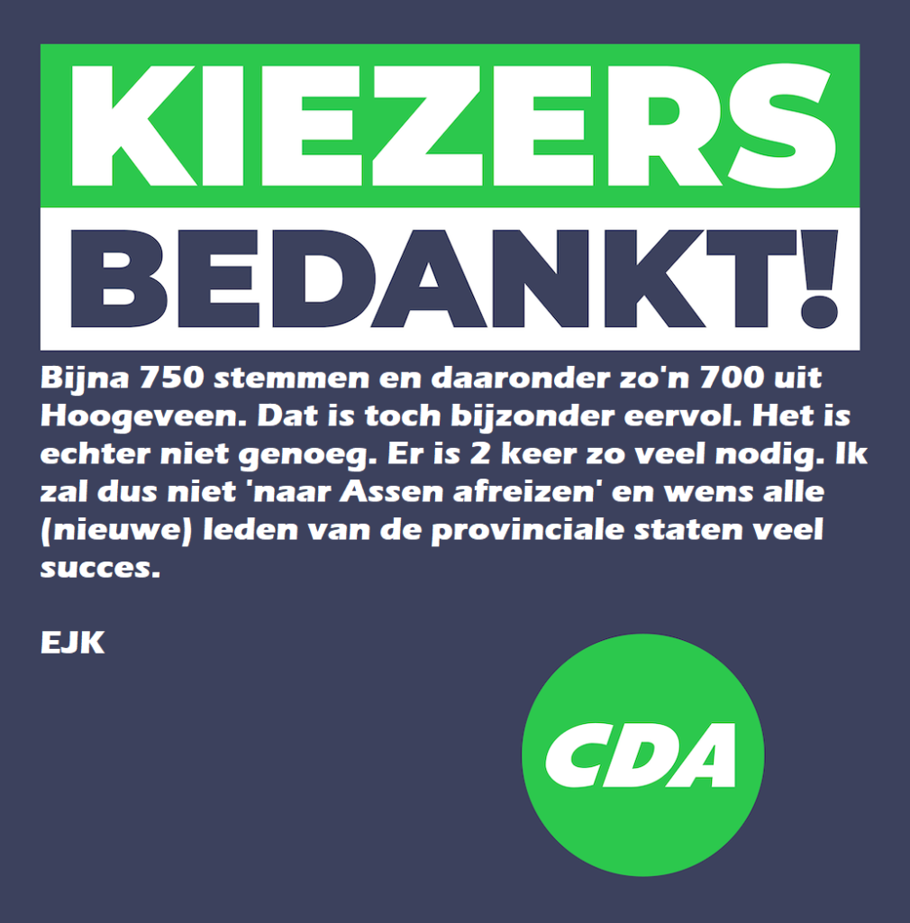 Met de campagne ‘Drenthe kan wel wat Hoogeveen gebruiken’ is een ‘mini-voorkeursactie’ gestart om vanuit de sterke kanten van Hoogeveen, de Hoogeveense stemmers aan te moedigen op een Hoogeveense kandidaat te stemmen. Bestuursvoorzitter Henk Reinders schreef daar een vlammende ingezonden brief over en herhaaldelijk werden Hoogeveense kandidaten aangeprezen, altijd wel met het accent op ondergetekende. Daarom is er ook dankbaarheid. Het glas is immers halfvol. Nog nooit werd er door de CDA-stemmers zo vaak op hun plaatsgenoot gestemd (relatief vaak dat wel!). Let wel het aantal CDA-stemmers is wel enorm gedaald t.o.v. voorgaande provinciale verkiezingen. Dus 30% van de CDA-stemmers in Hoogeveen stemde nu op kandidaat nummer 6. Dat is iets om dankbaar voor te zijn. Ik ben daar echt dankbaar voor.